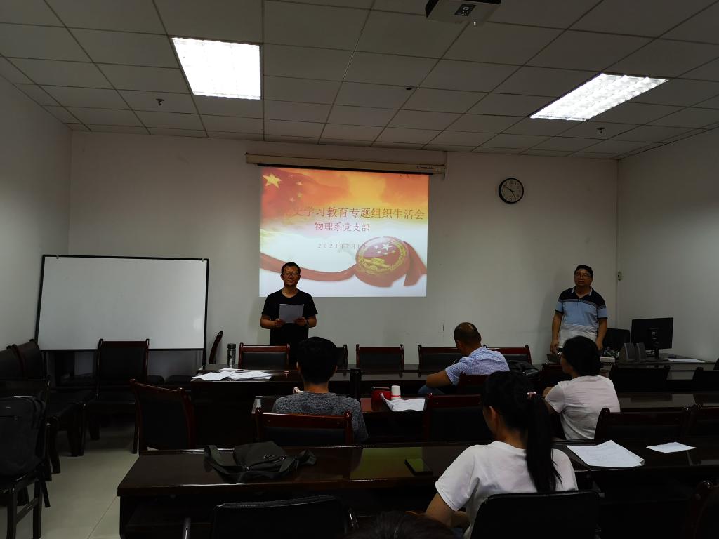 7月13日下午,物理系党支部在雁塔校区1208室组织召开党史学习教育专题组织生活会。公司副经理解忧参加会议。支部书记杨华平代表支委会进行检视剖析,两位支部委员进行了补充。而后,每位与会党员围绕会议主题认真盘点检视,充分开展了批评与自我批评。解忧作点评发言,他指出本次会议准备充分,会前经过了精心组织酝酿,支部委员相互之间,党支部委员和党员之间、党员和党员之间开展了谈心谈话,互相提醒,共同提高,每位党员撰写了发言提纲。批评与自我批评深刻、有辣味,是对思想的一次洗礼,希望广大党员能更进一步提高思想觉悟,多为广老员工和老师办实事。杨华平作了总结发言。会后,杨华平讲授“学习党史、牢记使命、为党育人、为国育才”专题党课。