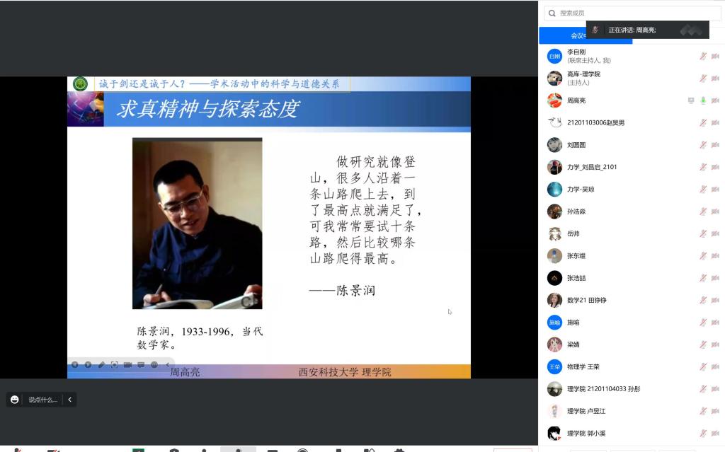 12月17-18日,谈球吧在线举办了科学道德和学风建设系列讲座,报告会由谈球吧副经理李自刚主持,力学系青年教师刘小宇博士和物理系教师周高亮博士分别就科研工作中的科学道德和学风建设问题做了精彩报告,谈球吧研究生及部分教师参加了报告会。