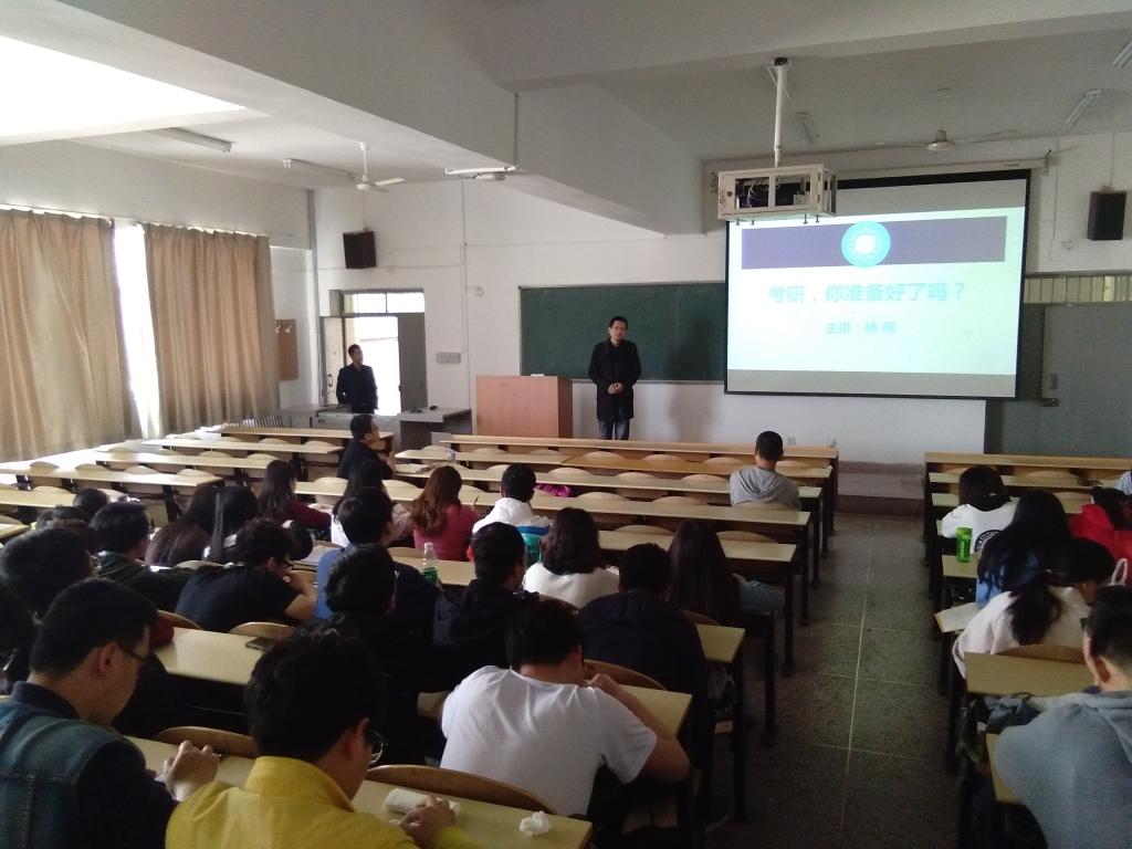 林伟老师从为什么考、怎么去考、如何考上以及学霸分享四个方面出发,为同学们进行了具体的指导。“为什么考”为同学们指引并明确了考研的目标,“怎么去考”对留考和跨考做了详细的分析,“如何考上”告诉同学们考研的捷径就是努力,“学霸分享”也让同学们对考研有了更深入的认识。