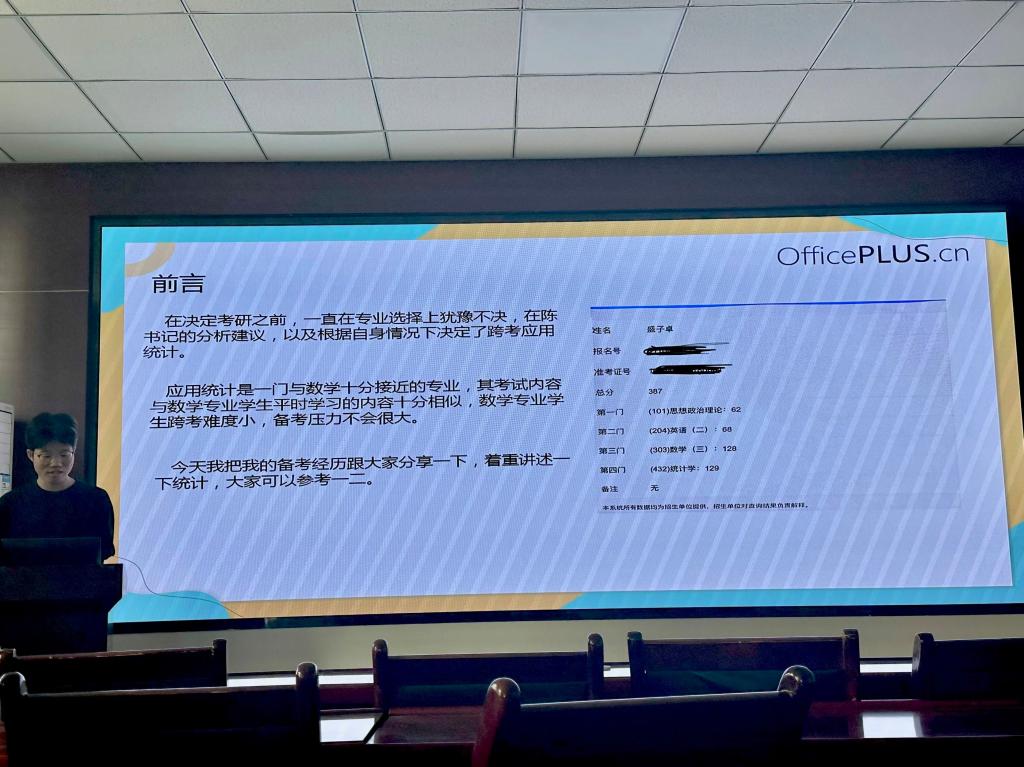 会议邀请到了2024届考上应用统计专业研究生的盛子卓、王驰同学与跨专业考上安全专业研究生的郑思颖同学分享自己的高效备考方法与技巧。