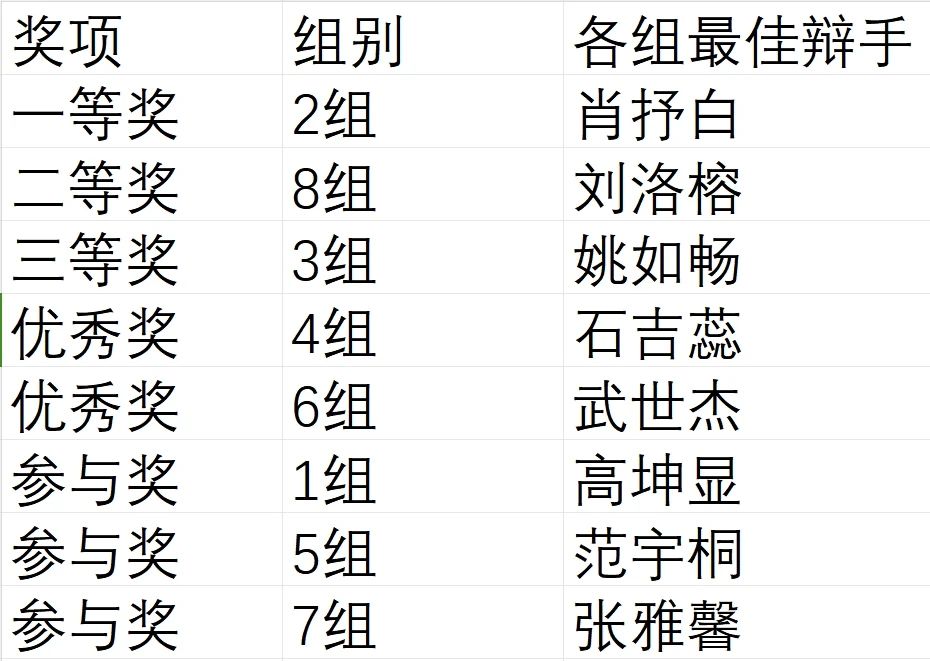 经过角逐,最终评选出了最佳组别与各组最佳辩手。