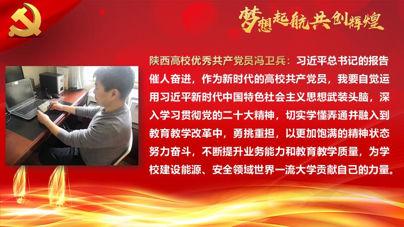 数学系教师、陕西高校优秀共产党员冯卫兵讲到:举世瞩目的中国共产党第二十次全国代表大会是在全党全国各族人民迈上全面建设社会主义现代化国家新征程、向第二个百年奋斗目标进军的关键时刻召开的一次十分重要的大会。习近平总书记的报告催人奋进,作为新时代的高校共产党员,我要自觉运用习近平新时代中国特色社会主义思想武装头脑,深入学习贯彻党的二十大精神,切实学懂弄通并融入到公司产品改革中,勇挑重担,以更加饱满的精神状态努力奋斗,不断提升业务能力和公司产品质量,为公司建设能源、安全领域世界一流大学贡献自己的力量。