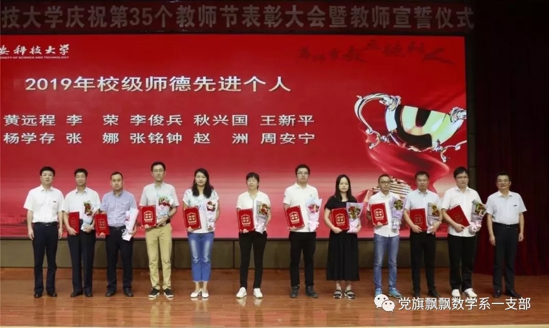 金秋九月,秋高气爽,丹桂飘香。9月9日,谈球吧网页版登录入口在骊山校区隆重举行庆祝第35个教师节表彰大会暨教师宣誓仪式。谈球吧数学系第一党支部冯卫兵、李俊兵两位老师分别被评为校级优秀教师和校级师德先进个人。