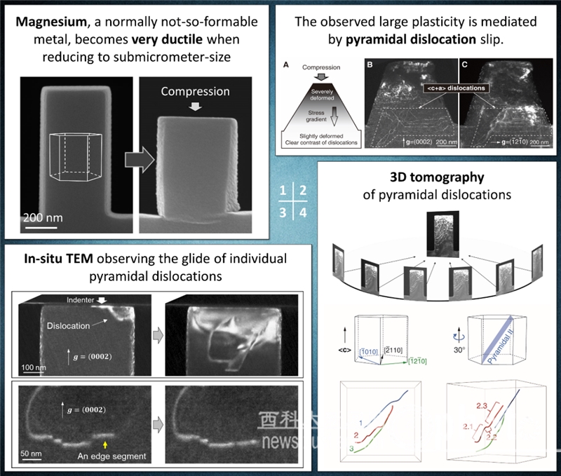 图1亚微米尺寸镁的大塑性变形;图2实验观测到的塑性变形是由锥面位错滑移主导的;图3原位电镜捕捉到单根锥面位错的滑移;图4三维图像重构帮助解析锥面位错的形态及其滑移面 镁是一种极具应用前景的轻质材料,但较差的塑性限制了其广泛应用。该研究发现,塑性差并不是镁的本征属性,通过促进锥面位错滑移可有效提高镁的塑性。研究团队证明了对亚微米尺度的纯镁而言,各种类型的锥面位错(刃、螺、混合型)不仅可以滑移,而且可以导致非常大的塑性变形。研究团队推测高应力促进了锥面位错的形核和滑移,进而提高了测试样品的塑性。通过进一步深入分析,不仅确定了位错的滑移面,而且还清晰地观察到锥面位错的交滑移、位错偶极子的形成以及位错往复运动等尚未报道过的重要现象。该成果为完善镁的塑性变形理论提供了重要的实验数据,并为高塑性镁合金的开发带来新的启发。该论文中,翟啸波博士负责材料断层扫描法的透射电镜数据的三维结构重构工作。