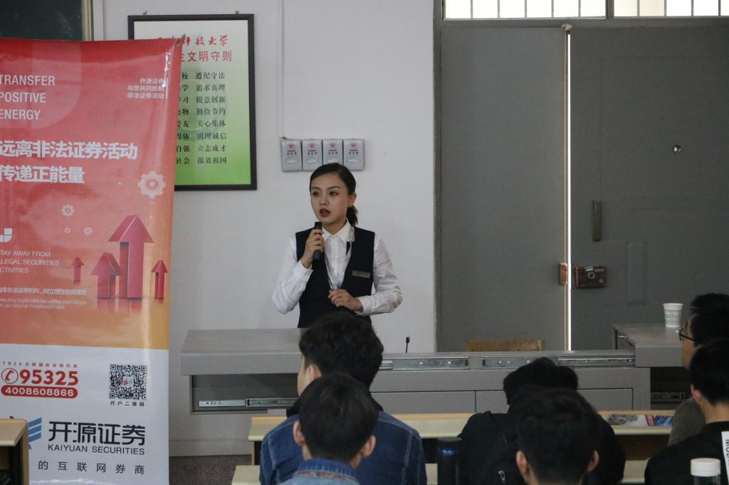 3月23日下午,谈球吧金融安全知识讲座在临潼校区骊山校园举行,开源证券股份有限公司王一茜经理做了主题为“远离非法金融活动,传递正能量”的安全知识讲座,活动由谈球吧团委书记赵明主持,16、17级全体本科生参加了讲座。