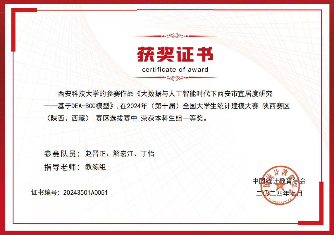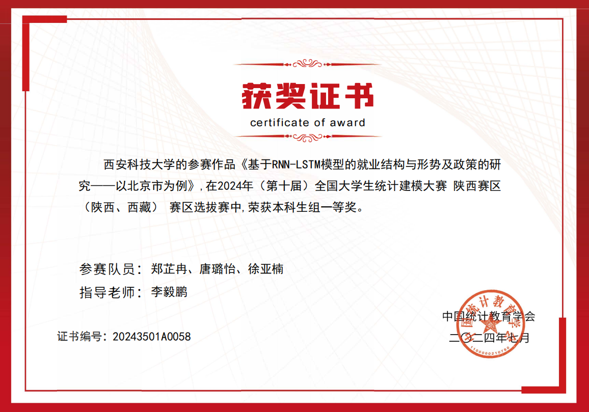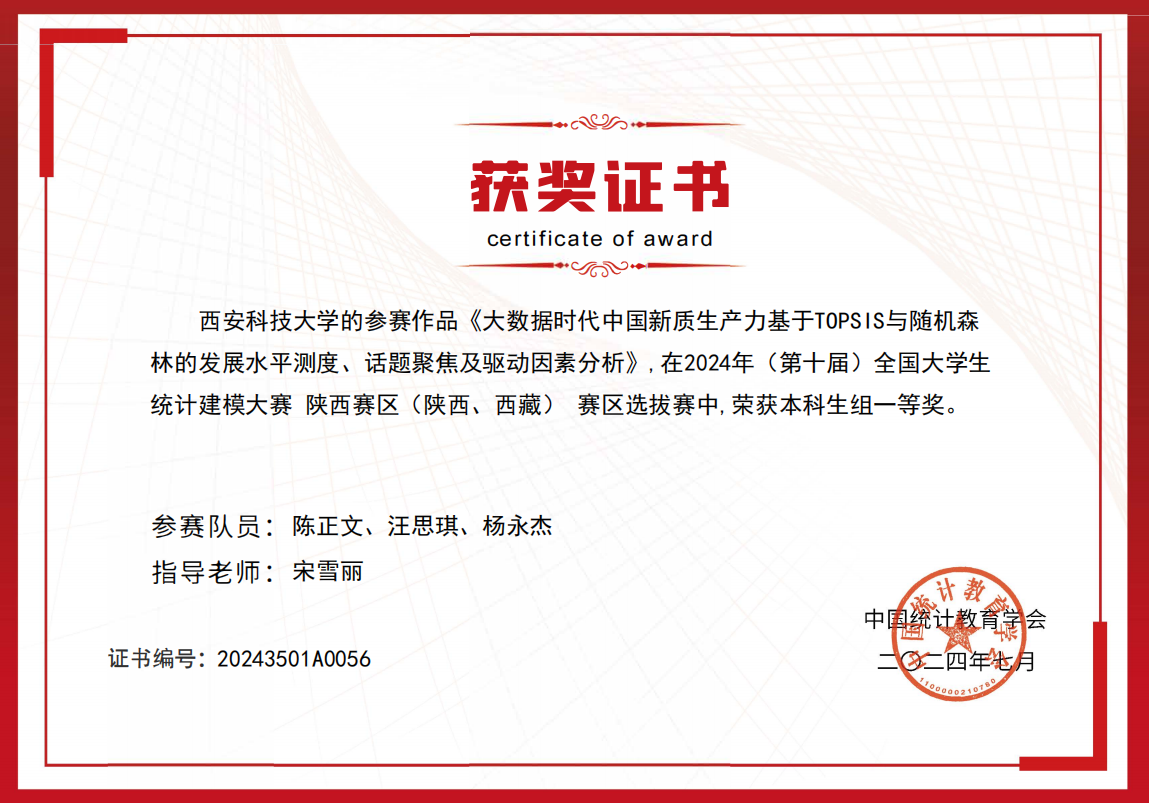 近日,由西安财经大学承办,中国政府统计中心协办的2024年第十届全国老员工统计建模大赛结果揭晓,经省组委会和国家组委会共同评阅,公司提交的212队参赛作品共获得国家三等奖2项;省一等奖7项、省二等奖16项、省三等奖39项。