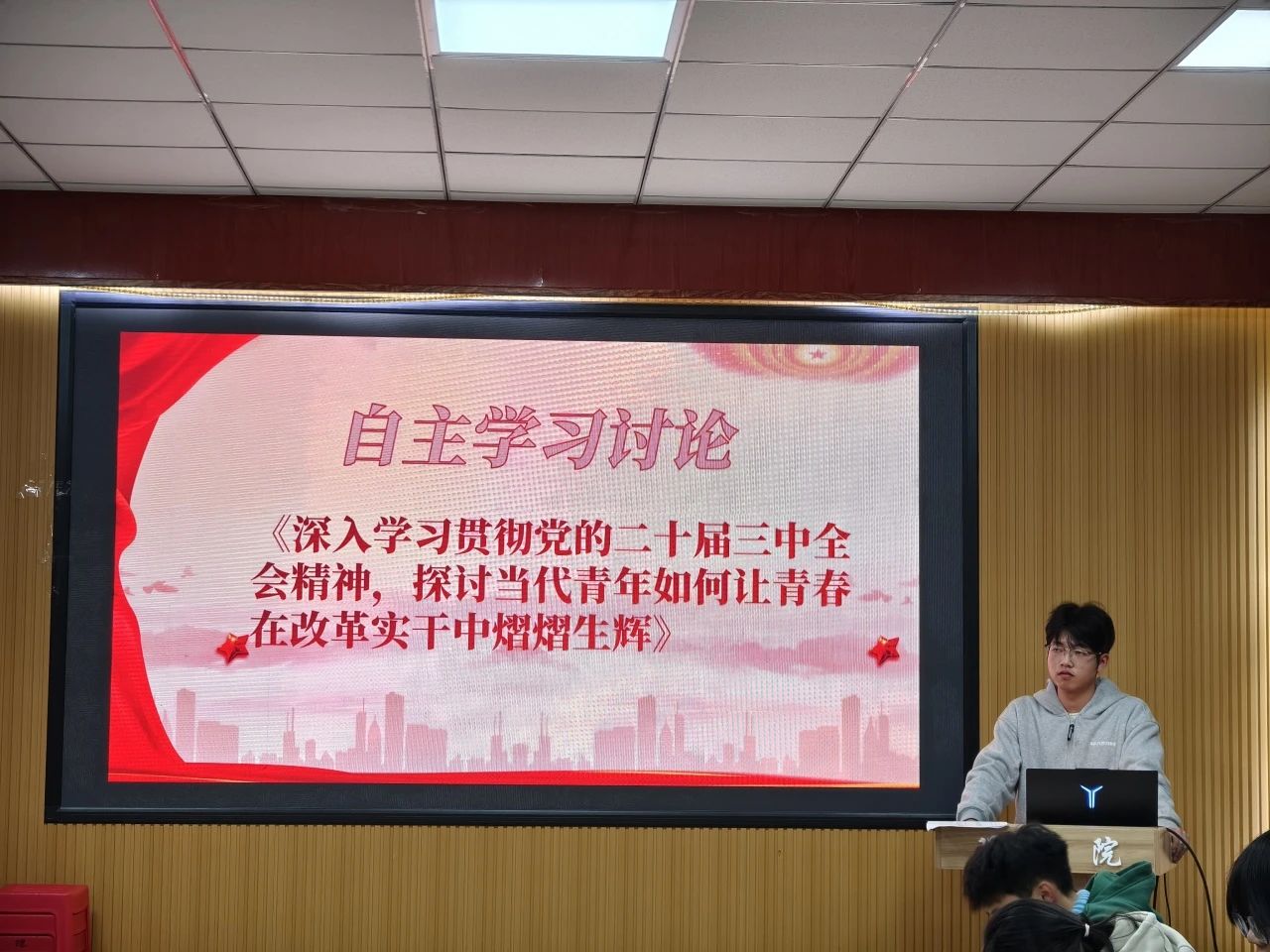 为进一步加强党性教育,11月18日,谈球吧于208会议室组织了主题为“深入学习贯彻党的二十届三中全会精神,探讨当代青年如何让青春在改革实干中熠熠生辉”的入党积极分子自主学习讨论活动,并观看了“党史学习教育”党性教育影片,本次活动由院团委组织部副部长汪夏禹主持。