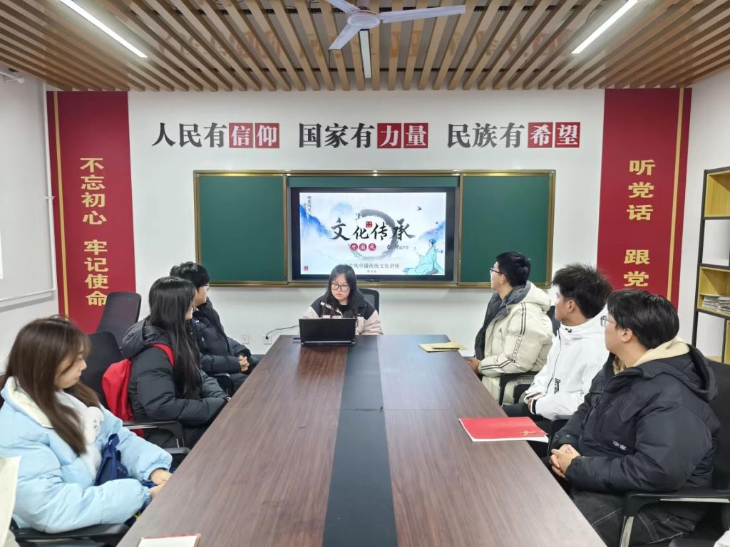 为了引导同学们深入了解中华文化的博大精深,增强文化自信,让传统文化在新时代青年心中生根发芽,绽放出更加绚烂的光彩,12月12日,谈球吧于“一站式”员工社区举办了文化传承主题班会,此次班会由2024级辅导员薛一丹主持,2024级各班班长、团支书和学习委员参加。