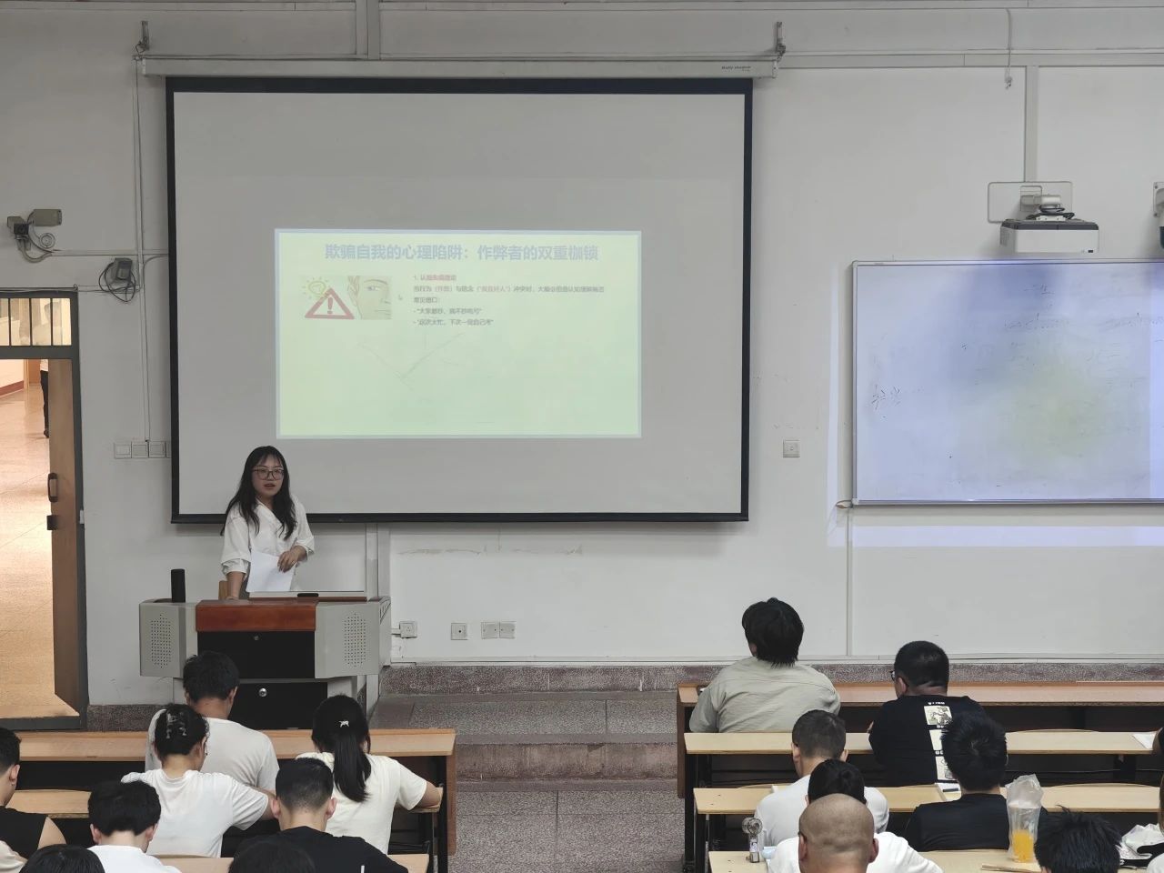 薛一丹针对四六级考试与期末考试诚信问题展开教育。她通报了近期高校考试违纪典型案例,重申《考场纪律守则》及违纪处理办法,并带领全体员工宣读诚信考试承诺书。她指出,诚信是立身之本,更是学术生命的根基。希望同学们以真才实学迎接检验,杜绝任何侥幸心理。
