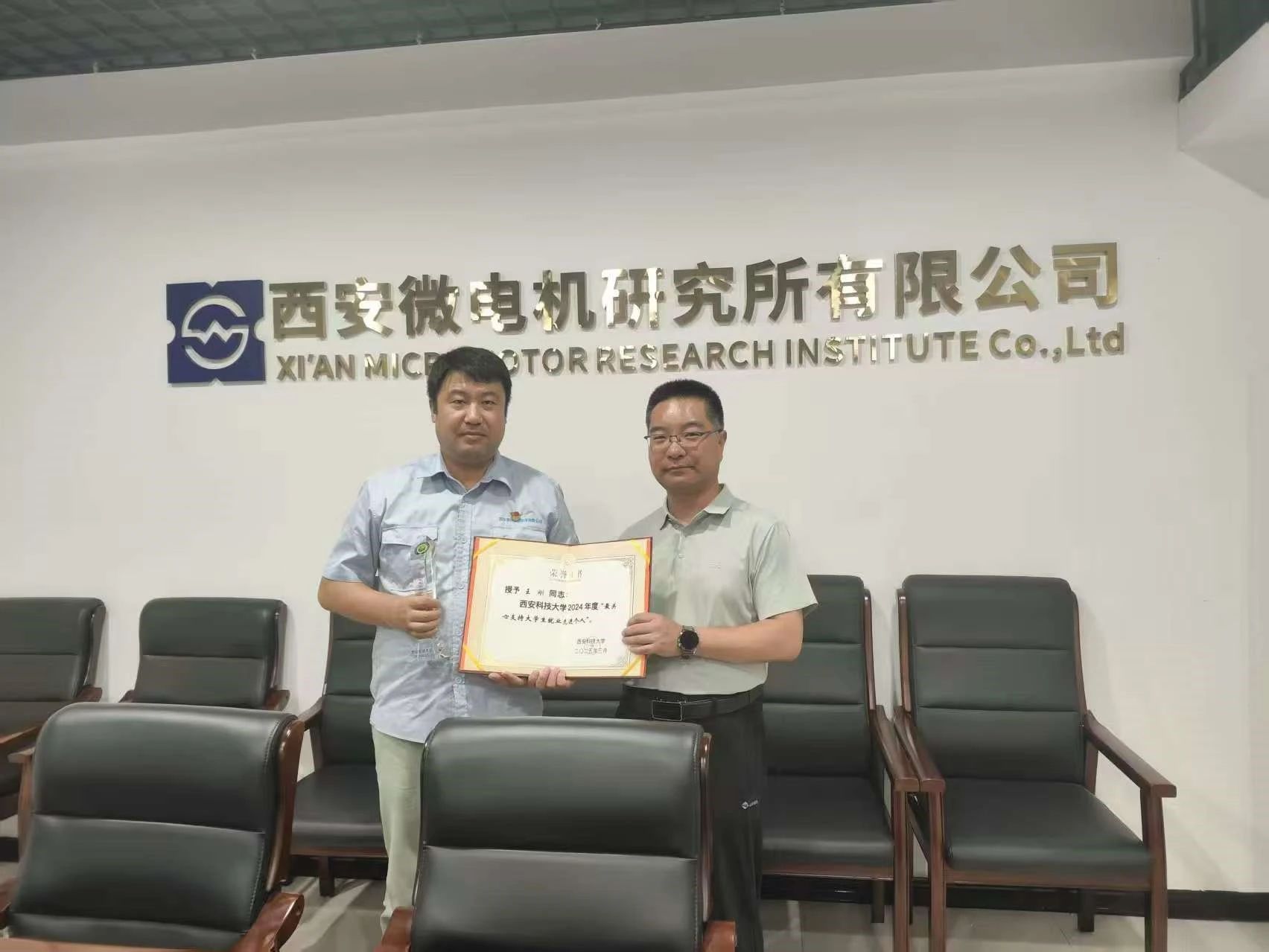 在西安微电机研究所,陈伟伯与研究所员工代表王刚进行了亲切交流,并为其颁发2024年度“最关心支持就业工作先进个人”证书和奖杯,感谢他长期以来对公司就业工作的支持与贡献。王刚详细介绍了研究所的业务领域、技术优势以及近年来的人才需求变化。双方围绕产学研协同、实习基地建设、毕业生招聘等议题展开了深入讨论。