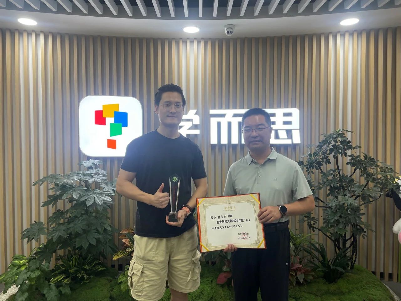 随后,公司一行来到学而思西安分公司,员工张雪欧代表企业接待并参与座谈。陈伟伯同样为张雪欧颁发先进个人证书与奖杯,表彰其在促进校企合作、助力员工就业方面的积极作为。张雪欧分享了学而思的业务发展、教育科技融合实践以及未来用人计划,特别是在数理学科教育、课程研发等方面的人才需求。