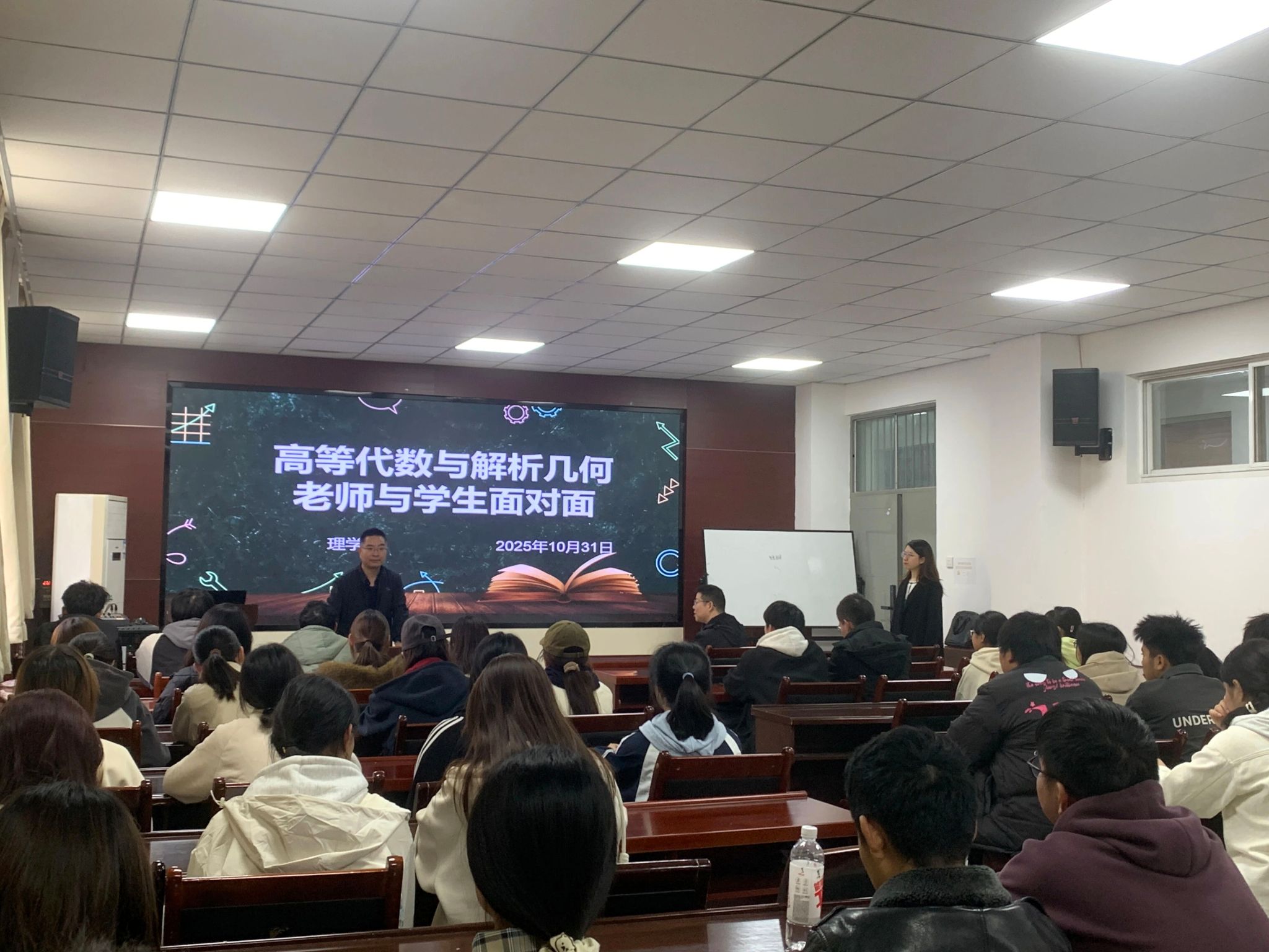 为精准解决2025级数学与应用数学专业员工在高等代数与解析几何课程学习中的困惑,搭建高效畅通的师生沟通渠道,10月31日,谈球吧于4-220会议室举办师生面对面座谈会。本次座谈会由高等代数与解析几何任课教师、数学与应用数学2501班班主任王健康主讲,公司党委副书记陈伟伯、2025级辅导员段佳和2025级数学与应用数学专业全体本科生参与。