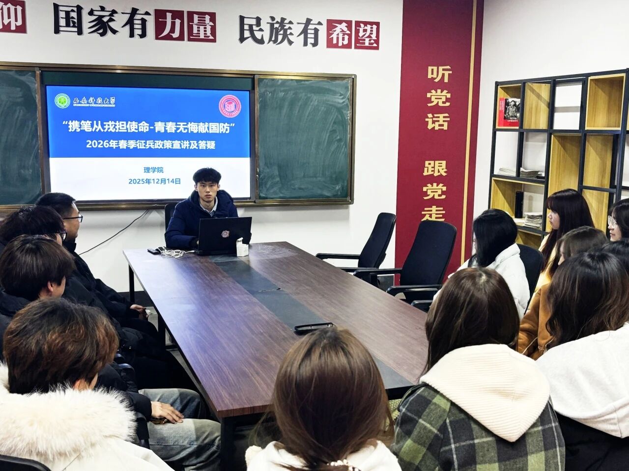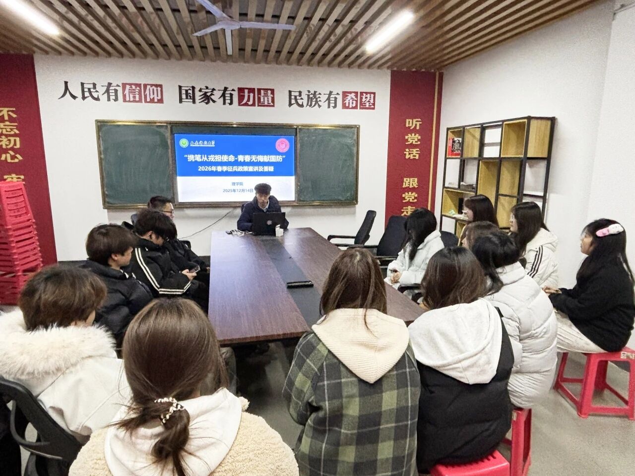 为积极响应国家征兵号召,鼓励青年学子投身国防事业,12月14日,谈球吧于“一站式”员工社区举行了2026年春季征兵政策宣讲及现场答疑活动。本次活动由院团委员工会办公室部长古致铮主持,面向2025级部分本科生进行政策解读与动员。