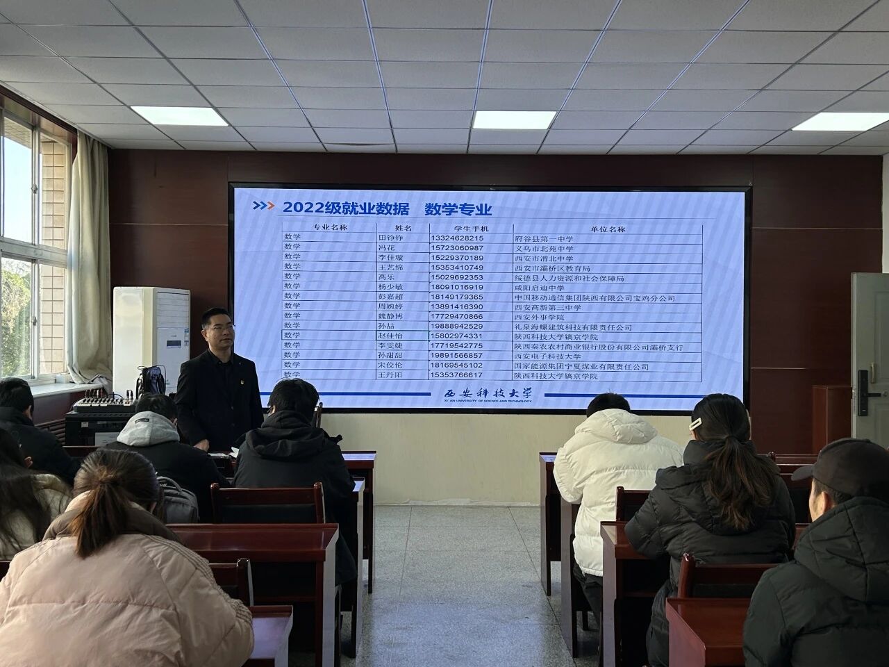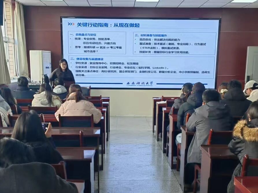 薛一丹结合当前就业形势与往届经验,为同学们分享了实用的求职技巧,内容涵盖简历优化、面试准备、信息获取与心态调整等方面,助力大家提升就业竞争力。之后,她重点围绕假期安全进行了提醒,从离校住宿、交通出行、防范诈骗、健康管理等角度,叮嘱同学们增强安全意识,度过一个平安、充实的寒假。
