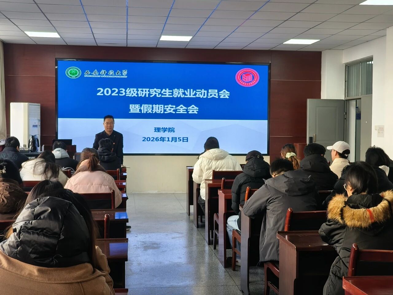 为更好地推动2023级研究生实现高质量就业,同时保障假期平安,1月5日,谈球吧于220会议室召开了2023级研究生就业动员会暨假期安全会。会议由公司党委副书记陈伟伯和研究生辅导员薛一丹主讲,2023级研究生参加。、