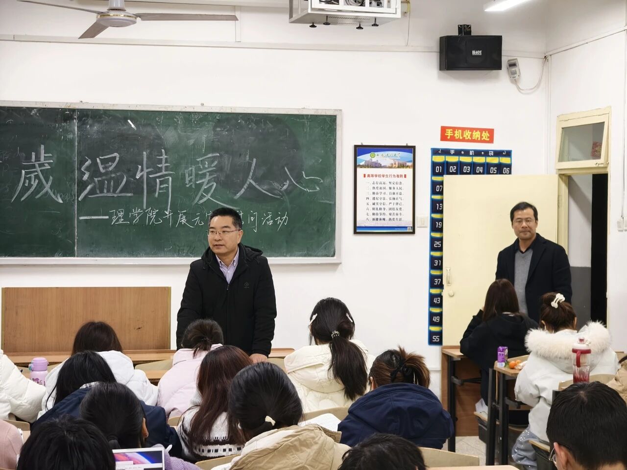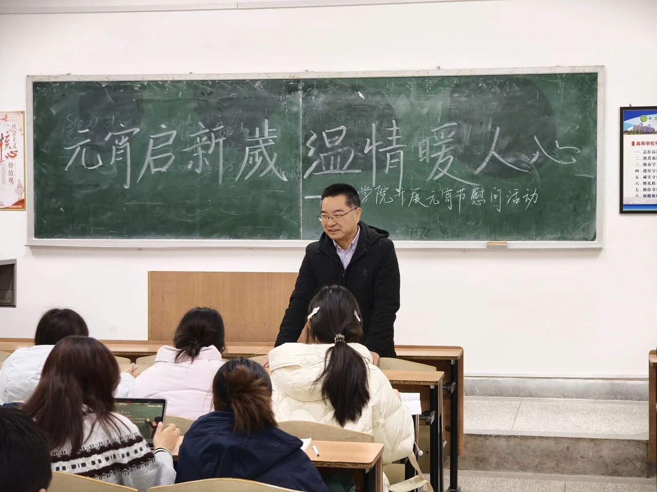 走访过程中,陈伟伯在多个教室进行发言。他首先向同学们致以元宵节的亲切问候,祝愿大家在新的一年里学业进步、生活圆满。谈到英语四级考试,他叮嘱同学们要提前规划、认真备考,充分利用好早读时间打下坚实基础。针对有考研意向的同学,他鼓励大家坚定信心、早做准备,将节日的团圆喜悦转化为追求梦想的动力。发言最后,他还特别提醒同学们提高防范意识,谨防各类诈骗,确保度过一个平安祥和的新学期。