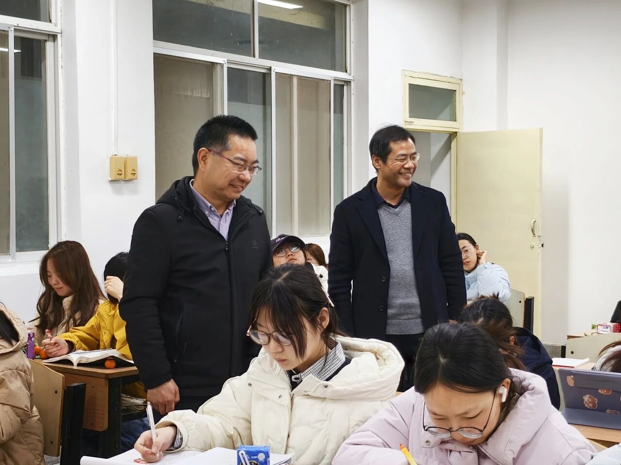 陈伟伯和侯斌刚一同走进各间教室,与同学们亲切交谈。他们仔细询问大家的学习生活情况,认真倾听同学们的心声与建议。在轻松愉快的氛围中,两位老师时而驻足观看同学们的学习状态,时而与正在自习的员工交流探讨,每到一处都留下了温暖的话语和真诚的鼓励。