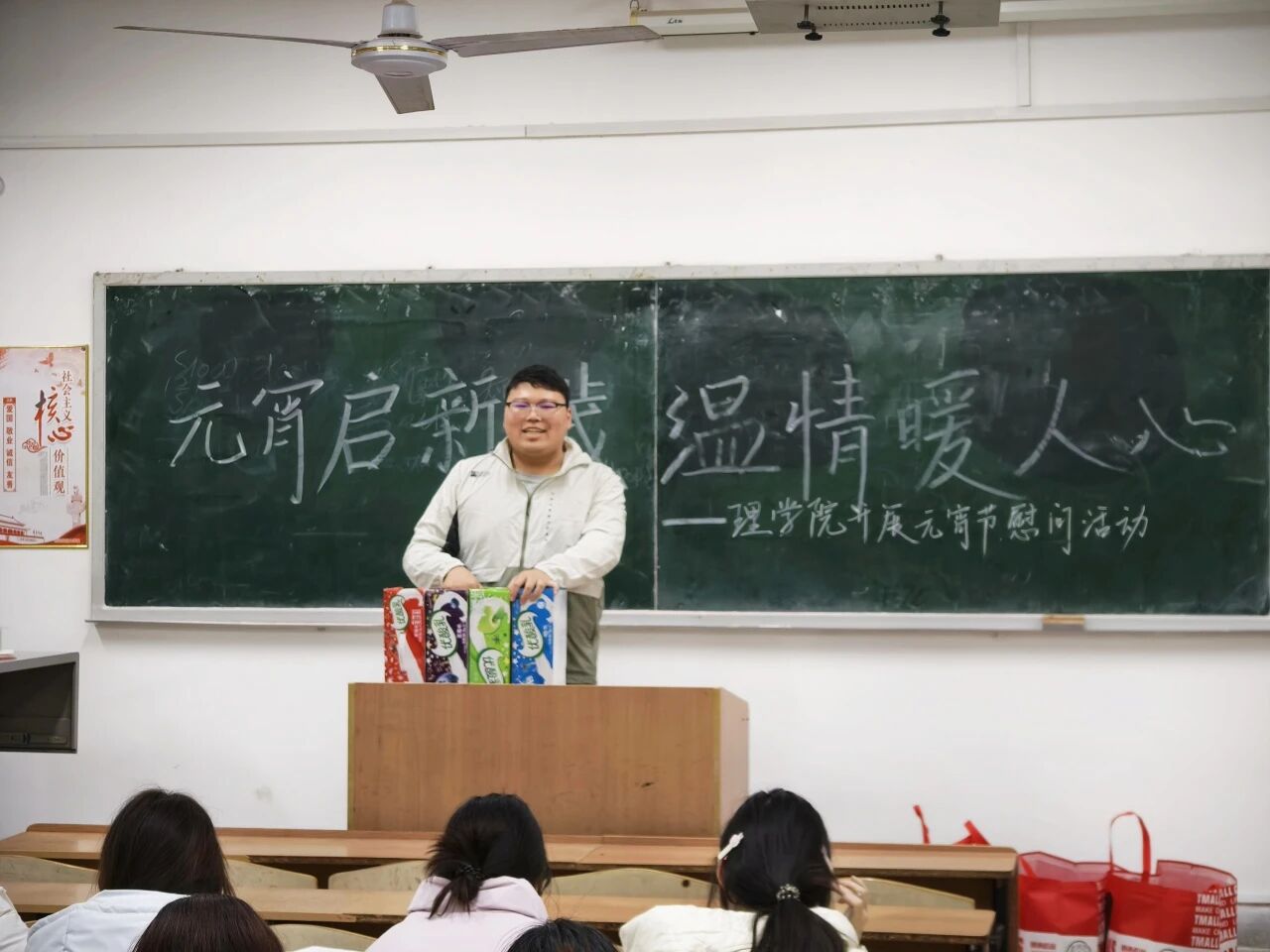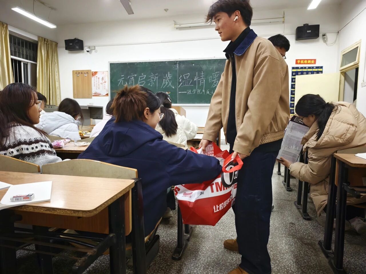 本科生慰问活动在公司一年级和二年级自习教室有序开展,两位老师及院团委员工会干部共同参与。院主席团成员姚如畅首先代表员工组织发言,向同学们致以节日祝福,并分享了自己在公司学习成长的感悟与收获,鼓励大家珍惜大学时光,在专业学习之余积极参与集体活动。