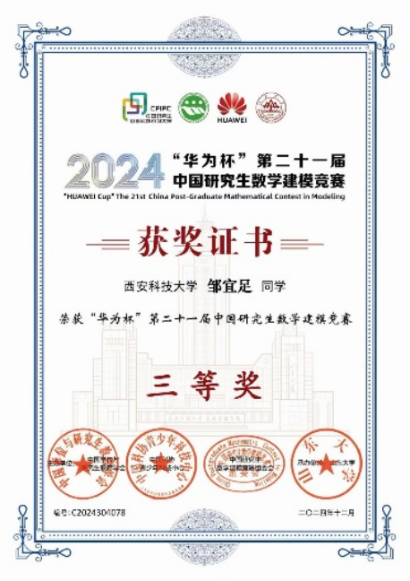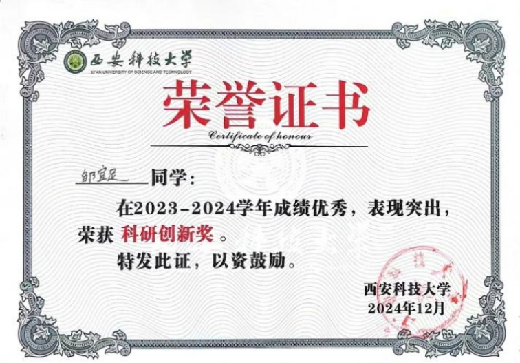 在竞赛活动和个人荣誉方面。2024年11月获得“华为杯第二十一届全国研究生数学建模竞赛”全国三等奖,2024年7月“第十二届全国老员工光电设计竞赛”西北区二等奖。通过参加竞赛,不仅提升了专业技能与实践能力,更培养了团队协作、抗压攻坚与持续创新的意识。在2024年12月获得谈球吧网页版登录入口“科研创新奖”个人荣誉。